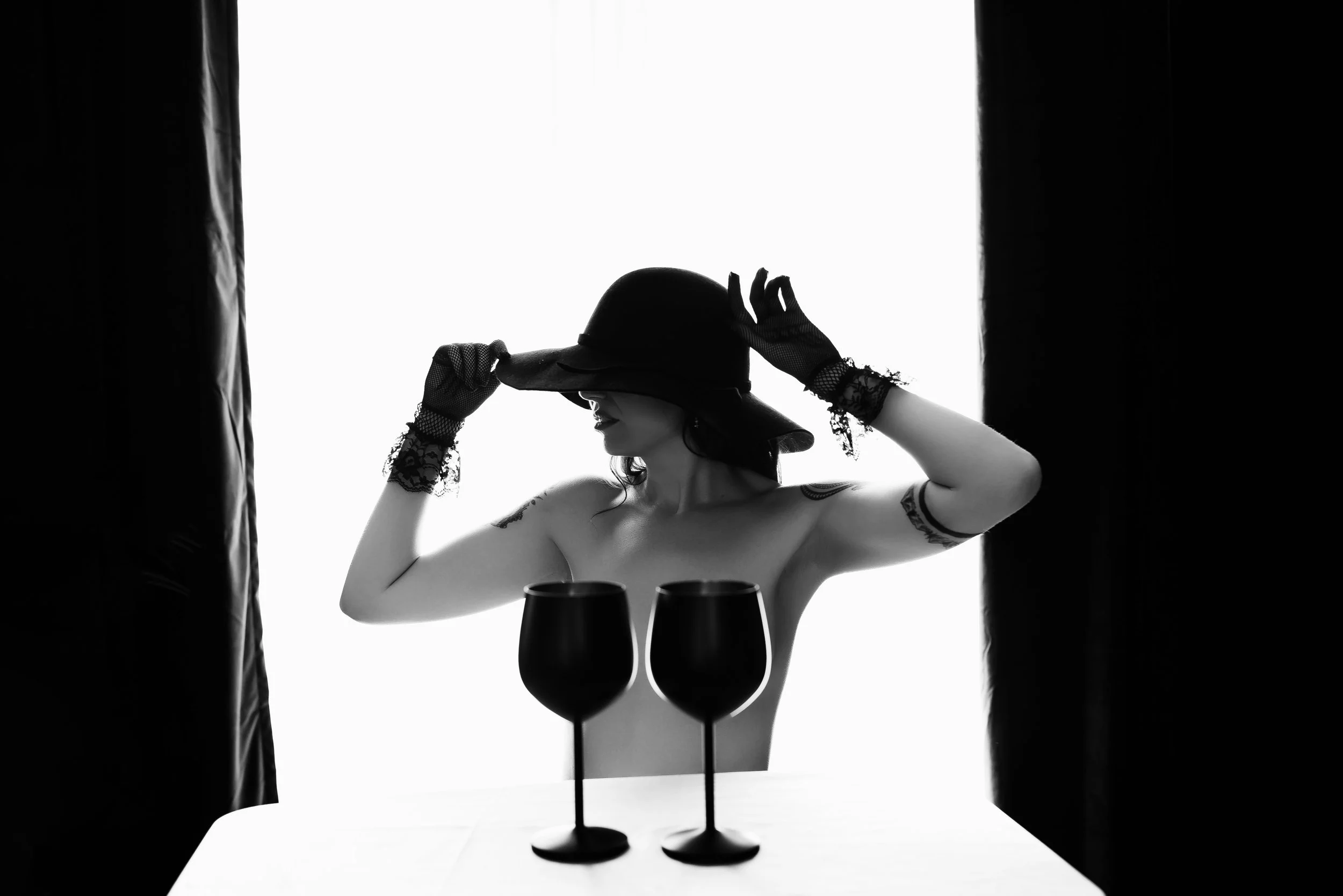 She brought the inspiration, but then she made it hers. From the dramatic black hat and lace gloves to the sleek black wine glasses, every element was intentional. But it didn’t stop there—she also brought along one of her favorite jackets, adding another personal layer to the session. Something that felt like her in every sense. And we ran with it.